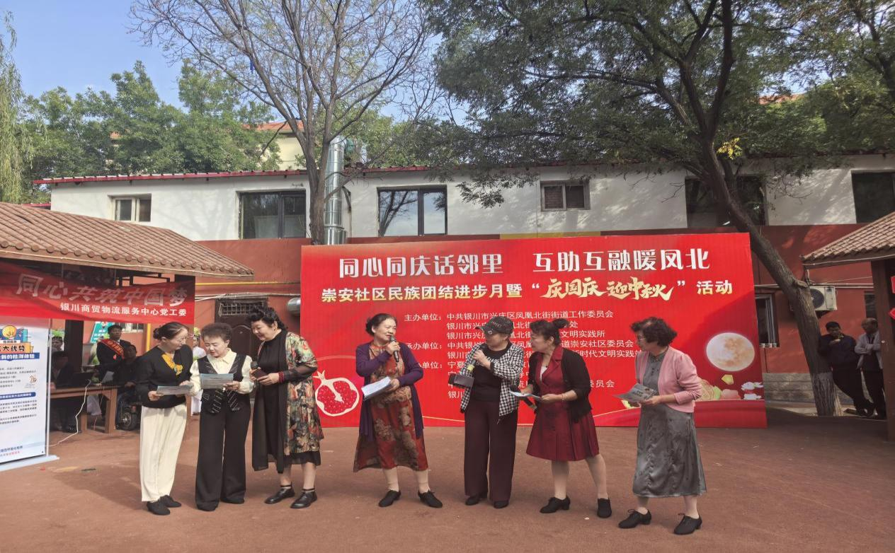 当中秋的明月遇上国庆的朝阳,当邻里的温情撞上民族团结的暖流,五星红旗与民族特色装饰交相辉映,空气中飘着月饼的香甜与居民的欢声笑语。2025年9月26日在国庆与中秋双节将至的喜庆时刻,崇安社区联合宁夏开放大学继续教育学院、宁夏社区教育指导中心在崇安社区唐徕小区二组团一场以“同心同庆话邻里,互助互融暖凤北”为主题的民族团结月暨双节庆祝活动,正在这里为各族居民开启一场“家”的聚会。