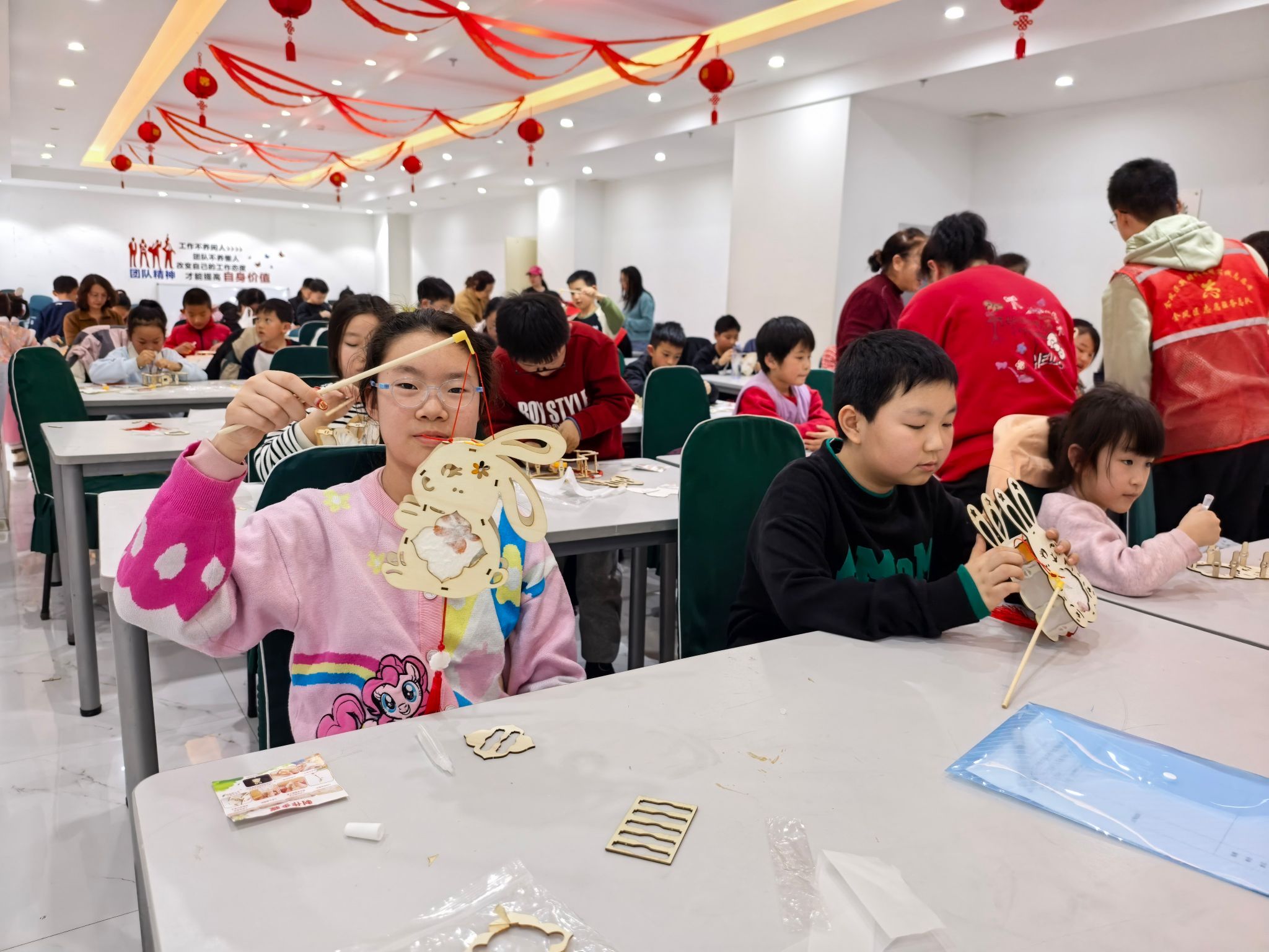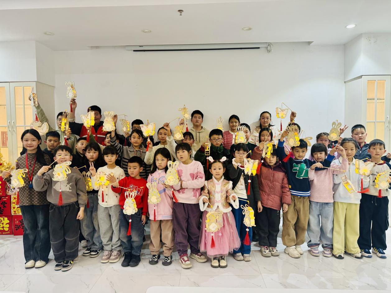 活动开始前,社区工作人员早已将制作花灯的材料整齐摆放到位,彩纸、竹签、流苏、胶水等一应俱全。志愿者为大家详细讲解了传统花灯的历史渊源、文化寓意,以及本次制作的兔子灯的步骤和技巧。“先把木质配件取下,再用胶水固定到指定为止,最后装上流苏和提杆就完成啦!” 老师一边示范,一边耐心解答小朋友们的疑问。