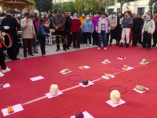 趣味互动添活力,老有所乐展笑颜。文艺表演结束后,活动进入趣味互动环节,志愿者带领老人们跳起“热身拍拍操”,迅速点燃现场气氛。“蔬菜套圈圈”游戏中,老人们踊跃参与,套中时的欢呼声与欢笑声不绝于耳;“蒙眼铲零食”环节中,大家手持小铲细心操作,每有收获引来阵阵喝彩,让老年人在欢乐中感受社区的温暖与关怀。